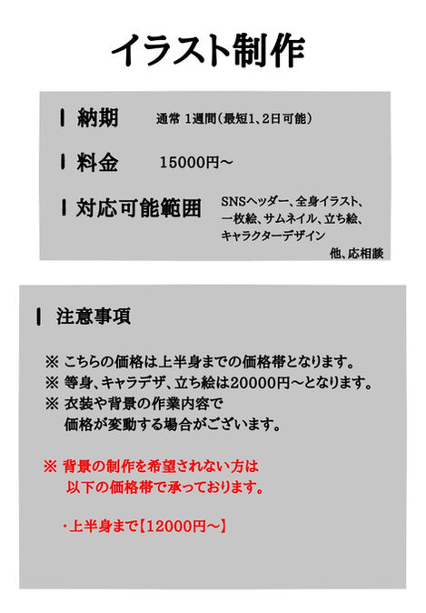 ※ラフ画やイラスト完成後に小物追加、大幅な構図変更等は要相談または対応出来かねます。